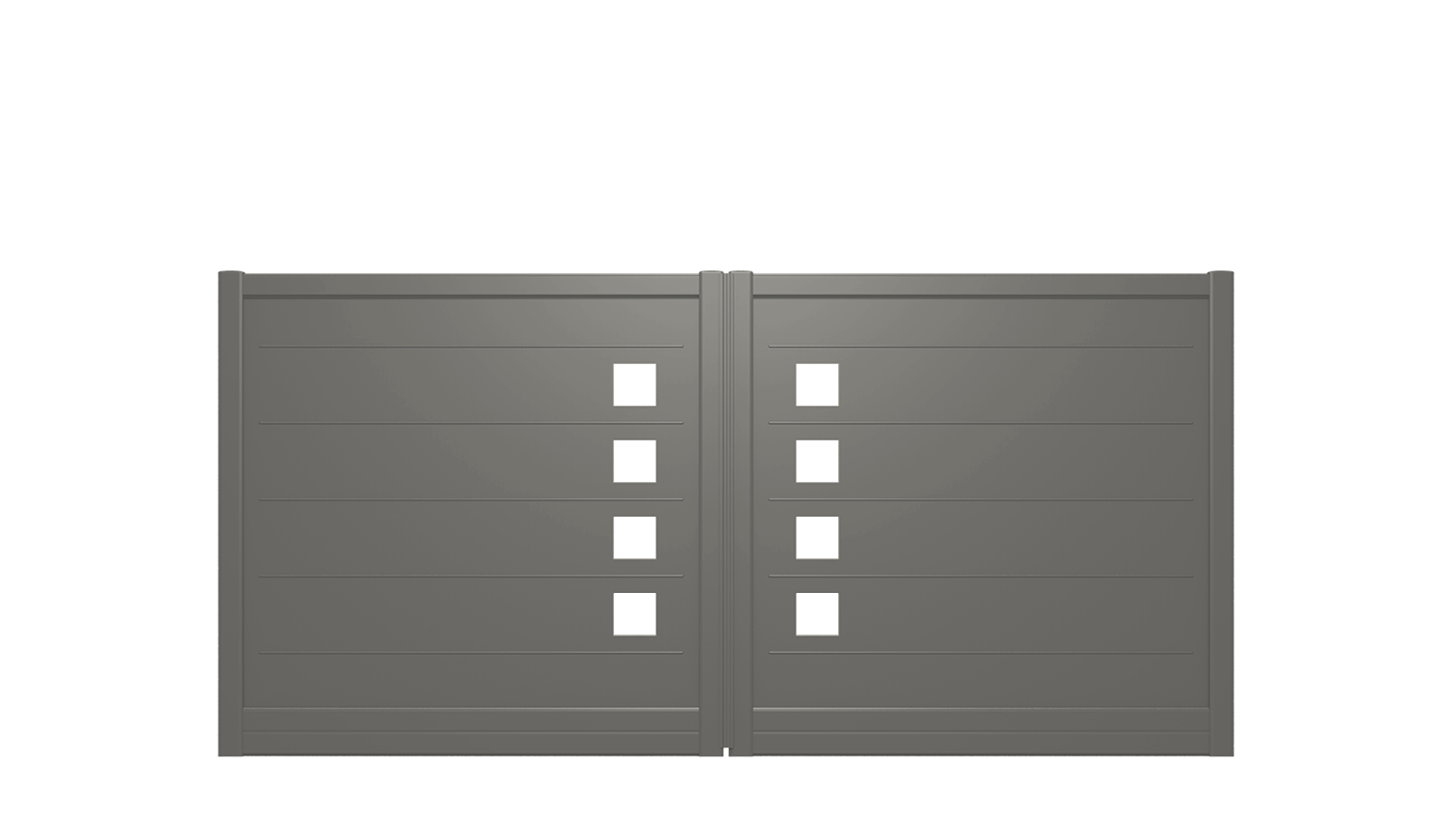 Le portail 2 vantaux est le plus classique et celui qui s’adapte le mieux à tous les environnements (sol plat, en montée grâce au gond de pente qui relève les vantaux à l’ouverture). D’une utilisation simple et confortable, il peut être facilement équipé d’un système de motorisation. Ouverture du portail possible jusqu’à 180°(idéale pour un accès tournant) suivant le type de pose. Configuré en 2/3- 1/3, le plus petit battant fera office de portillon, plus pratique à utiliser que de grandes ouvertures de portail.