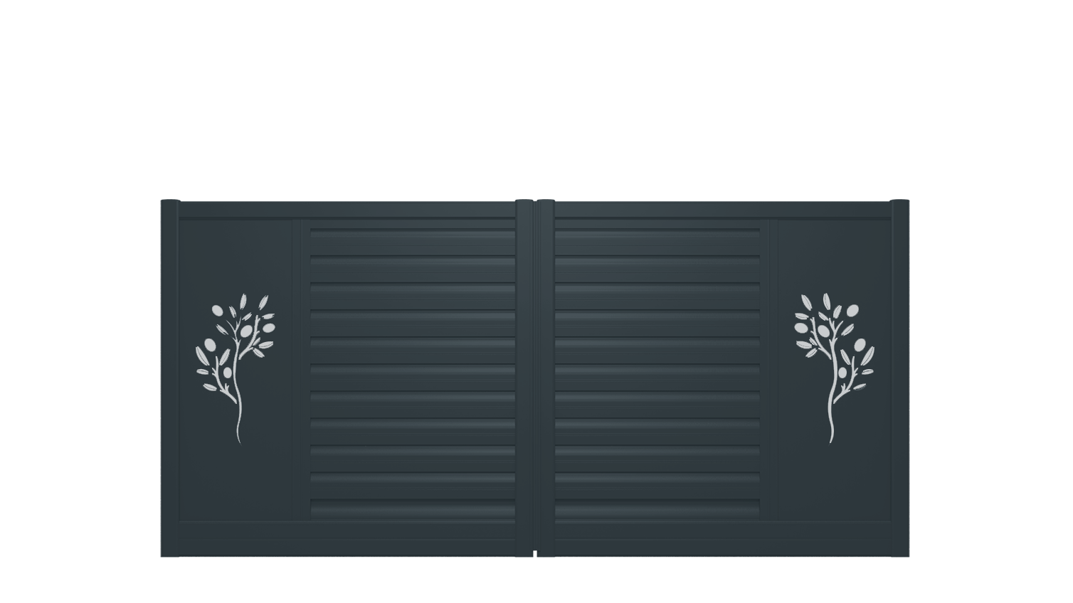 Ce portail sent bon la garrigue ! Les lames brise-vent en partie centrale viennent souligner les panneaux lisses extérieurs où sont élégamment découpés de symboliques décors ‘branches d’olivier’. Ne manquent que les cigales.